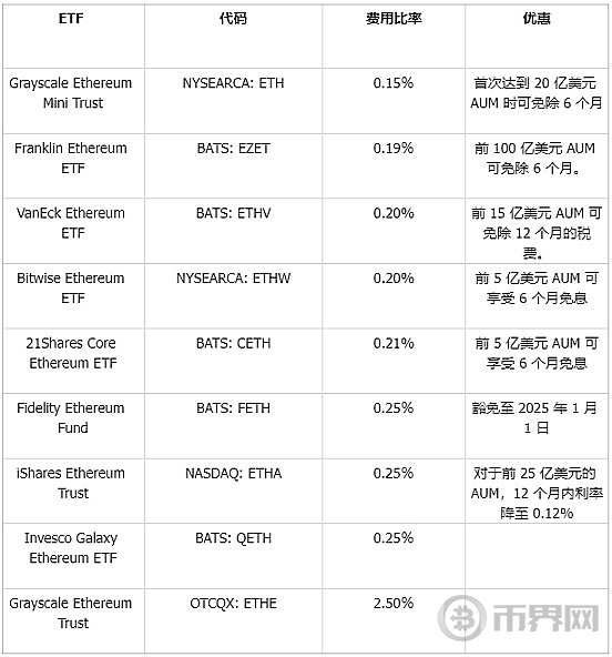 大多数 ETF 发行人都实施了六个月的费用豁免期。有两只 ETF 没有豁免期。ETHE ETF 将会有 10% 的份额被转移到 Grayscale Ethereum Mini Trust,因此没有费用豁免期。Invesco Galaxy Ethereum ETF 似乎也没有费用豁免期,因此从费用比率来看,这并不是最好的选择。