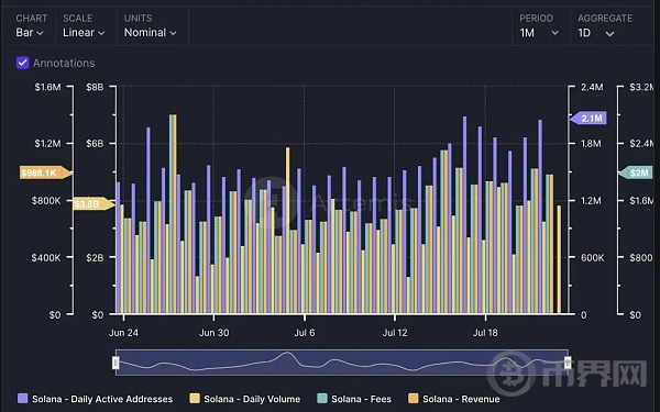 (一)多项数据领先近段时间以来,Solana 在市场上的表现引人注目,多项关键数据超越以太坊,吸引了众多机构的增持。价格方面,SOL 价格近期创下近三个月新高,过去 30 天涨幅约 31.1%,超过比特币和以太坊。Artemis 数据显示,过去一个月,Solana 日交易量增长 40.5%至 4370 万美元,每日活跃地址数上涨 75%达到 210 万个,TVL 上升至 52 亿美元,涨幅约 26.9%,日交易费用增长超 33.3%至 200 万美元,日收入也上涨超 33.1%。Coin98 Analytics 报告显示,Solana 的费用和收入在今年二季度大幅增长,创造了超过 2600 万美元的收入,同比增长 42 倍以上,SOL 总交易量达到 2920 亿美元,较去年同期增长近 7 倍。Dne 数据显示,Solana 流动性质押率升至 6.58%,前三大供应商的主导地位下降,市场更加健康和多元化。