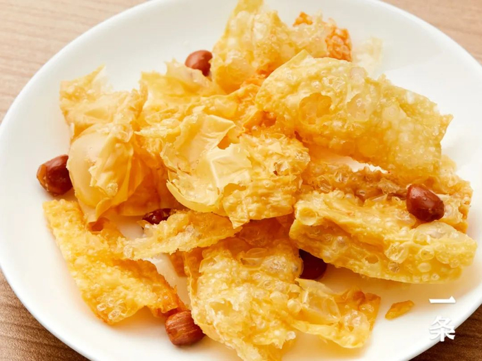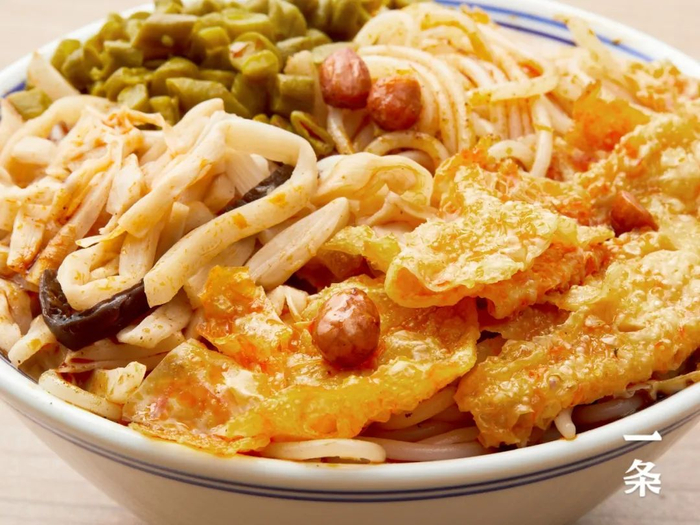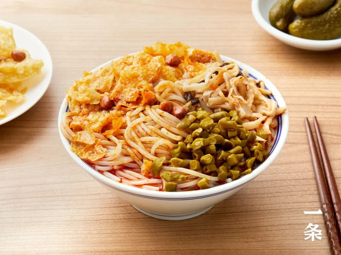 炸到酥脆的花生和腐竹,直接撒到螺蛳粉上,浸润了汤汁后,吃起来更口感丰富。