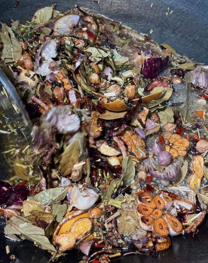 螺蛳汤底,是用漓江石螺加入香料炒制,再和新鲜大骨一同用小锅熬制而成。