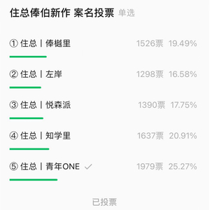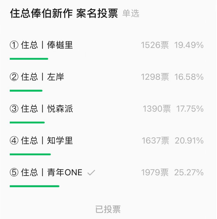 7月24日,住总俸伯新作案名投票活动重磅上线,备选案名以WLB职住平衡生活主张为基础,从地铁首站从容自在的出行生活,潮白河湾惬意宜居风景,低密洋房与自然诗意栖居,陪伴孩子的成长学府和结识志同道合邻里的青年住区等灵感出发,在短短两天引发7830人次投票。最终,更匹配青年生活主张的「住总丨青年ONE」脱颖而出,以超高热度让青年住区被青年群体所定义,成为年轻人对生活居所期待的理想体现。