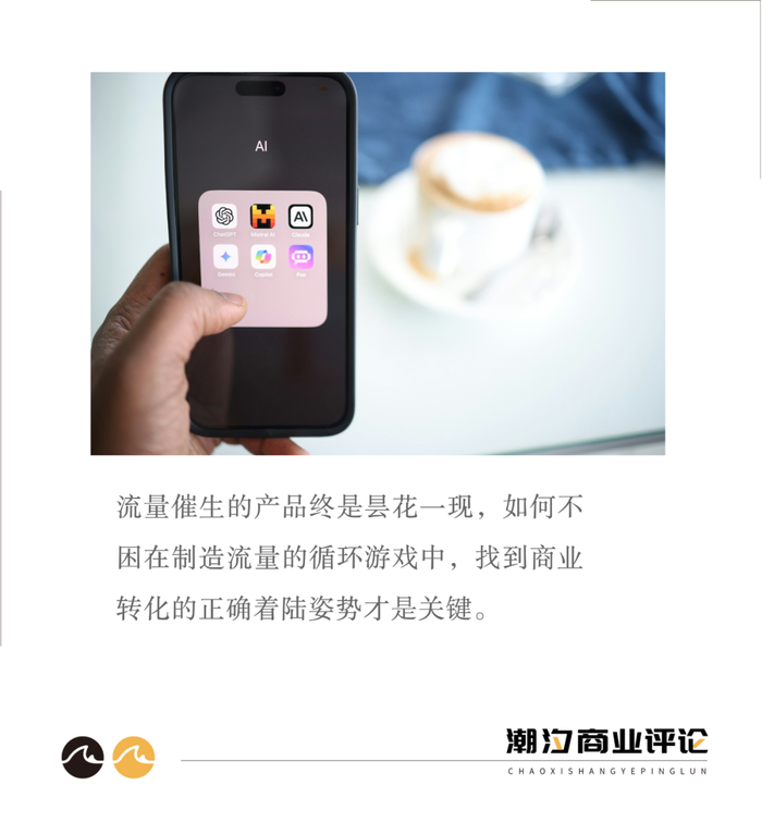 拆解上面的流程实则有两波流量,AI应用作为流量接口吸纳第一轮“泼天富贵”,导流后的主APP承接第二波空降流量,找寻商业转化落点。