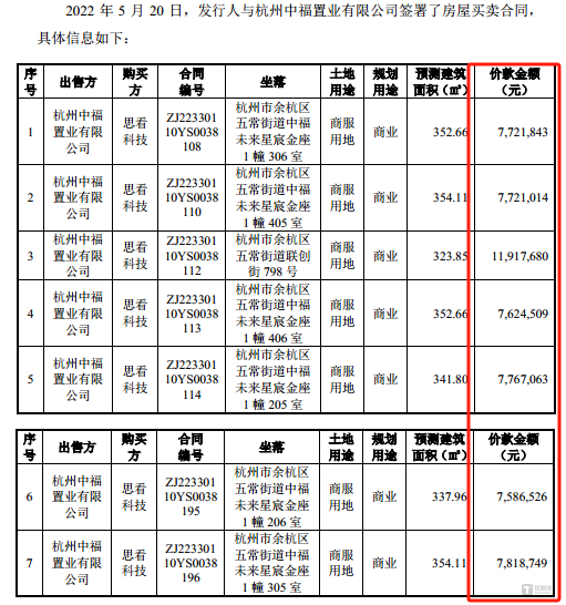 特别要说明的是,早在2022年,思看科技就已经大举购置房屋。公开资料显示,2022年5月,思看科技与杭州中福置业有限公司签署了房屋买卖合同,共7份购房合同,总价合计为5815.73万元,具体情况如下: