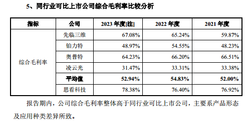 此外,思看科技的产品还拥有着极高的毛利率,报告期内,思看科技的毛利率分别为76.92%、76.4%、78.38%,同行可比公司平均值分别为52%、54.83%、52.94%,毛利率至少超同行均值近22个百分点。