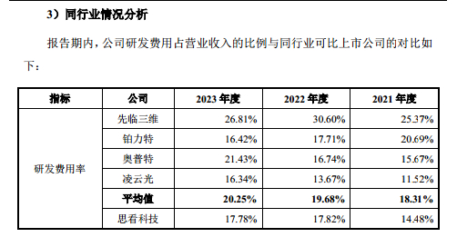 令人不解的是,报告期内,思看科技的研发费用率分别为14.48%、17.82%、17.78%,同行可比公司平均值分别为18.31%、19.68%、20.25%,研发费用率始终低于同行均值。那么,思看科技是如何在研发费用率低于同行均值的情况下,毛利率还反超同行均值近22个百分点?