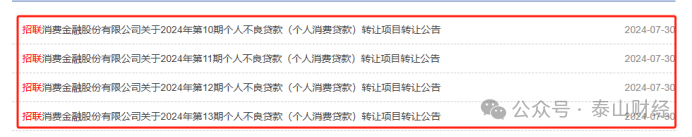 7月30日,招联金融公布了2024年第10期、11期、12期以及第13期个人不良贷款转让项目转让公告,未偿本息金额分别为6.97亿、1.86亿、3.24亿、4.57亿,合计本息金额为16.64亿元。