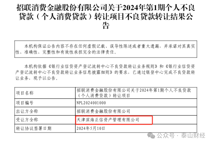 日前,招联金融2024年第1期不良贷款资产包被出让给了天津滨海正信资产管理有限公司,受让方拿到不良贷款资产包后,是否会对逾期借款人提起诉讼仍不可知。