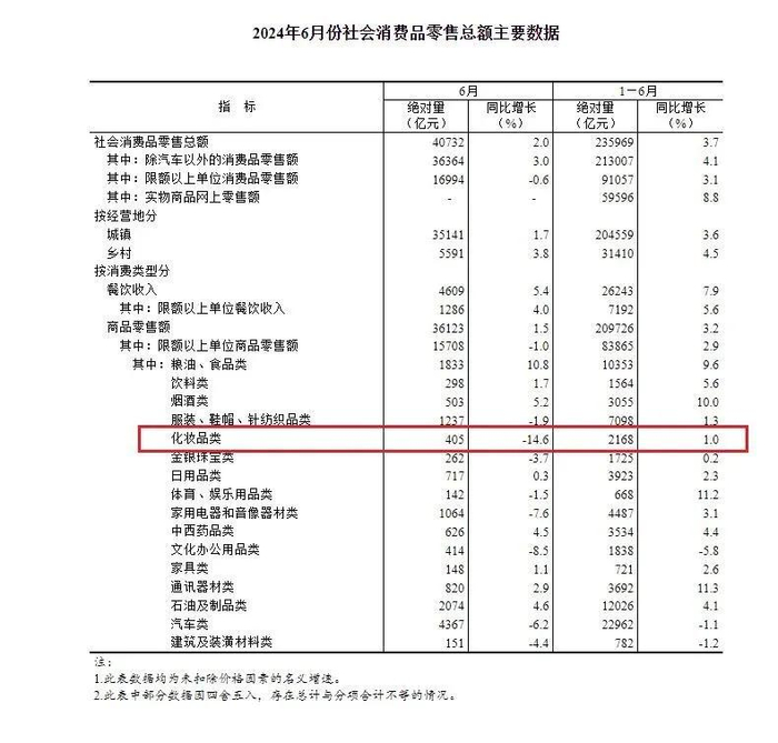 2024年以来,中国化妆品市场更是遭遇到了极大的考验。今年6月化妆品类零售总额为405亿元,同比下降14.6%,创下今年单月最大跌幅。这也是近10年来,化妆品零售总额首次在6月份出现下滑。