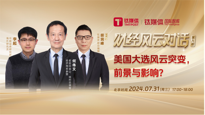 第九期《钛媒体财经风云对话》,主持人钛媒体副总编辑胡润峰,特邀前驻旧金山、纽约总领馆经济商务参赞,钛媒体国际智库专家、全球化智库高级研究员何伟文,中邮证券研究所海外研究员李起来共同探讨美国的变局及影响。