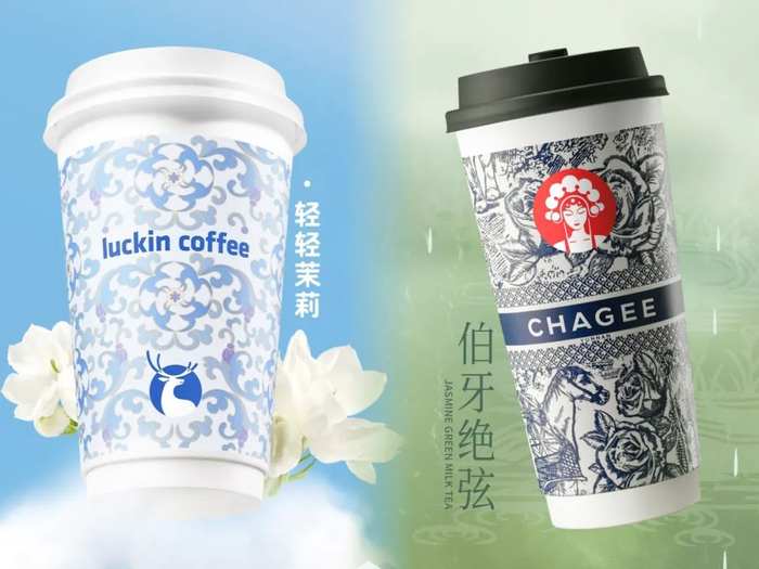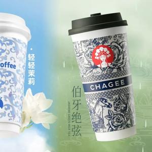 两款产品的杯身也不乏相似之处,轻轻茉莉使用了国风样式的宝花奔鹿杯和“三品管”,而这跟霸王茶姬颇多相似之处。