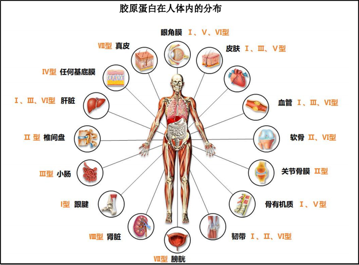 胶原蛋白是人体主要的细胞外基质,在人体中主要参与细胞的增殖、分化、迁移和信号传递,对皮肤、软骨、肌腱、韧带和内脏等组织器官起着支撑、修复、保护等作用。