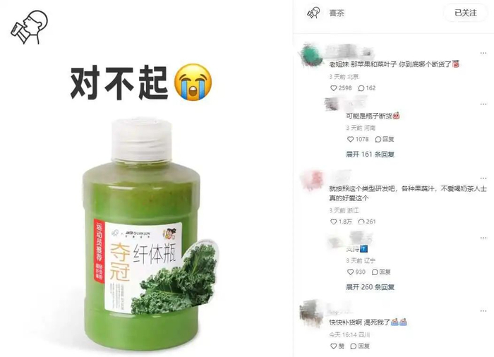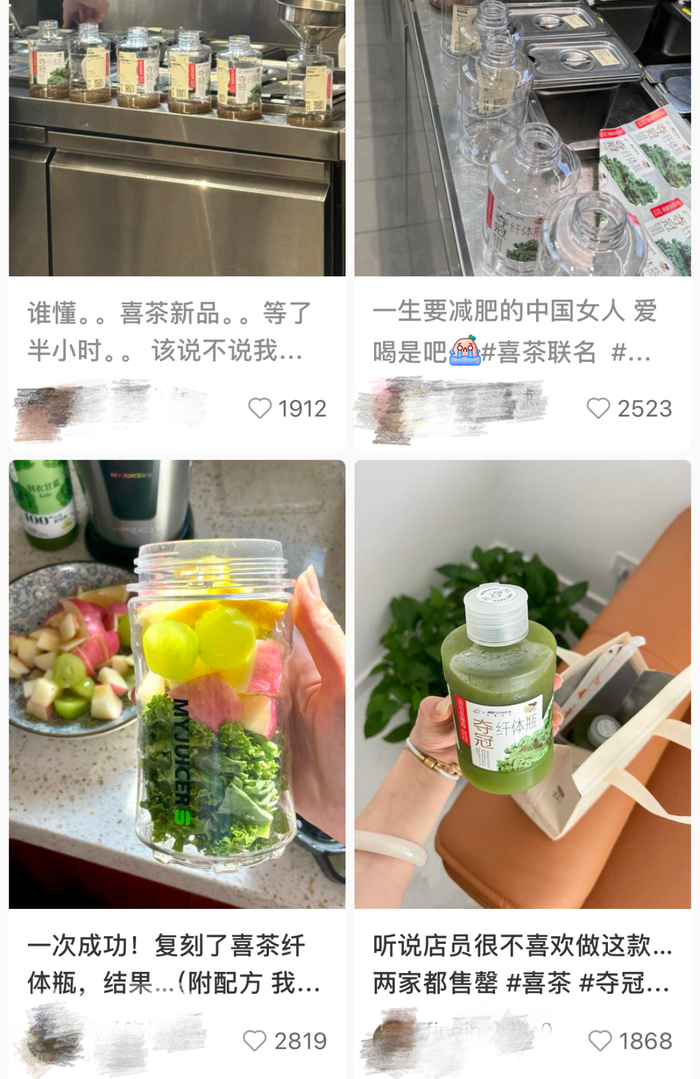 喜茶有关人员告诉我:“纤体瓶的火爆程度完全超出了我们的想象,店员切菜、减脂、通便这些流量标签都由网友自发形成。因此出现了意料外的【原材料缺货】现象。”
