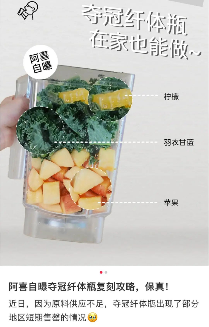 让人意想不到的是纤体瓶还拯救了著名的积灰小家电破壁机。洞察趋势的盒马,更是在线上线下都直接推出了复刻直达通道,年轻人先是在盒马get同款材料,再跟着博主一步一步制作,最后拿出废弃多年的破壁机等待结果。