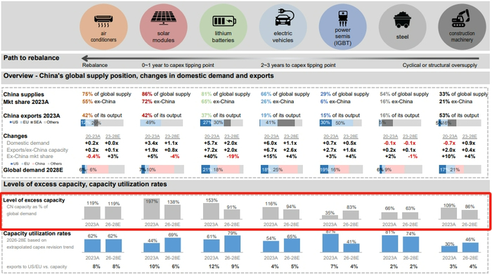 其中,光伏组件的产能是全球总需求的197%,锂电池是153%,新能源汽车116%,空调119%,工程机械109%。另外,功率半导体35%,钢铁66%。