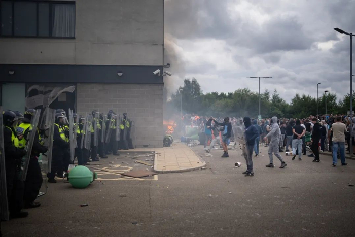 在接下来的几天里,曼彻斯特、伯明翰、利物浦、桑德兰、利兹、罗瑟勒姆等几十个城镇都爆发了规模不一的骚乱。即便在官方已经辟谣嫌疑人不是穆斯林或非法移民之后,极右翼早已被点燃的情绪也再无法压制。一时间,英国数个城镇中心处处起火。少数族裔经营的小商铺被洗劫,安置难民的酒店被打砸,穆斯林司机驾驶的出租车被烧毁,被燃烧弹焚毁的警车更是不计其数。