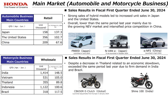 在2024财年的第一季度,本田公司的增长主要得益于全球摩托车和混合动力汽车的强劲销售,尤其是在印度、巴西、日本和美国等主要市场。