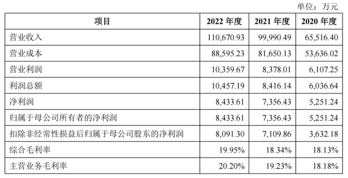 从财务数据上看,招股书显示,2020年—2022年(下称“报告期”),埃索凯的营收分别为6.55亿元、10亿元、11.07亿元;净利润分别为5251万元、7356.4万元、8433.6万元。