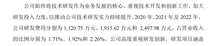 再看研发费用方面,报告期内,埃索凯研发费用分别为1120.75万元、1915.62万元和2497.98万元,占营业收入的比例分别为1.71%、1.92%和2.26%。