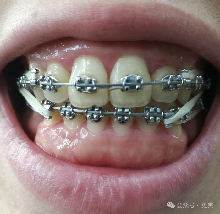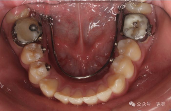用普通正畸牙套,拉动牙齿向正前方移动排齐,并配合缩弓器拉动嚼牙内向收缩,