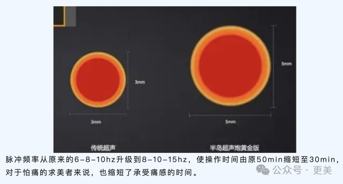 所以会大大缩短达到终点的时间,解决同样一种问题,一代治疗40-50min,黄金超声炮只需20-30min就能完成,治疗时间缩短了30%左右。