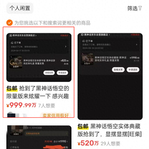 《黑神话:悟空》制作方游戏科学公司官网显示,目前游戏共四个版本,分别是售价268元的数字标准、328元的数字豪华版、820元的实体豪华版和1998元的实体收藏版。在闲鱼上,已经有不少商家售卖该游戏,不少人标价1—2元。