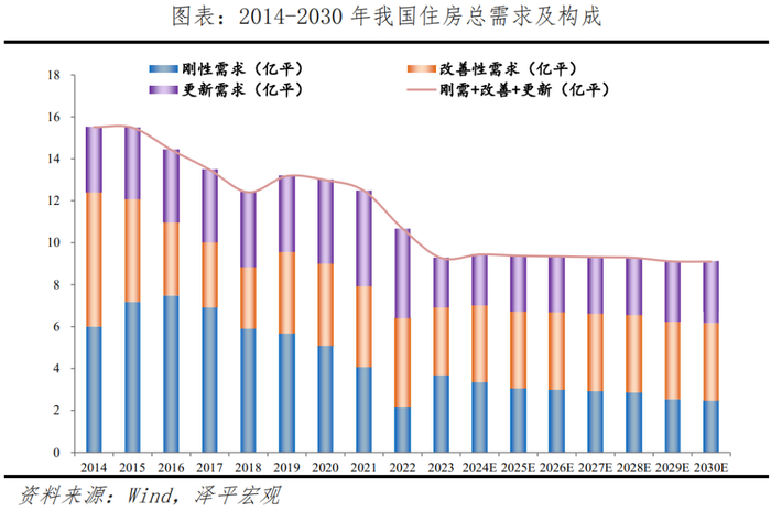 我们预计到2030年,我国住房需求缓慢下降至9.1亿平方米,其中,刚性需求2.5亿平、改善性需求3.7亿平、更新需求2.9亿平。从结构来看,2024-2030年刚性需求、改善性需求、更新需求占比分别为29.0%、41.1%、29.8%,改善性需求成为我国住房市场最大的需求支撑。