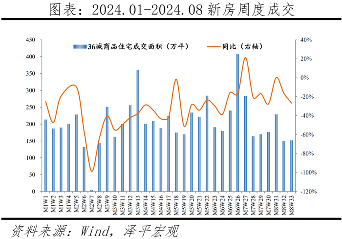 商品住宅方面,从月度看,2024年5月36城样本城市商品住宅销售同比-33.5%,环比增长4.9%;6月销售同比-14.3%、降幅较5月收窄19.2个百分点,环比增长28.6%;7月销售同比-10.8%、降幅收窄3.5个百分点,环比-26.1%、弱于季节性;8月(截至8月18号,下同),销售同比下降17.3%、降幅扩大,环比-12.6%、弱于季节性。从周度看,8月前三周销售同比分别变化-0.1%、-16.4%、-26.8%,同比降幅持续扩大。