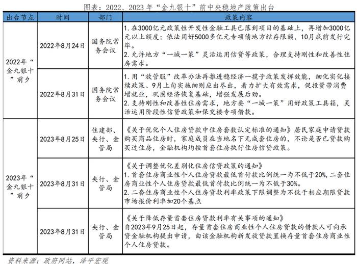 3)最后,政府往往会根据上半年经济、行业运行情况,在邻近“金九银十”时间节点,出台一系列调控政策,以稳定下半年房地产市场。过去两年的“金九银十”前夕,均有稳地产政策出台。2022年8月,中央支持地方“一城一策”满足合理刚性和改善性住房需求,各地方降首付、上调住房公积金贷款额度,积极“保交楼、稳民生”;2023年8月,中央打出“认房不认贷”、降首付、降利率等政策组合拳,旨在刺激市场活力,促进房地产交易。