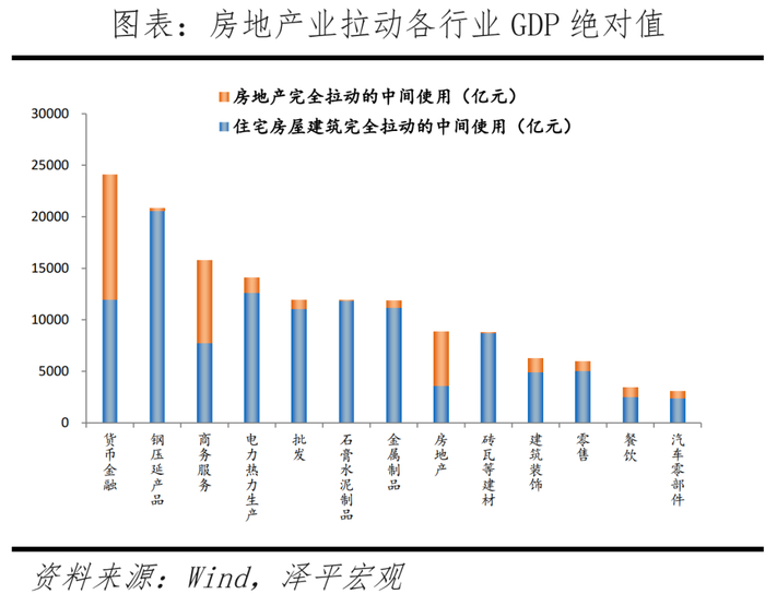 从上下游行业带动看,房地产带动几十个上下游产业链产值。房地产通过投资、消费既直接带动与住房有关的建材、家具、批发等制造业部门,也明显带动金融、商务服务等第三产业。根据国家统计局最新的2020年投入产出表,我们估算出广义的房地产业完全拉动上下游产业链GDP10.0万亿元、直接拉动上下游产业链GDP2.4万亿元。分行业看,货币金融、零售、钢压延、石膏水泥由广义房地产行业拉动的GDP增加值居前列,分别为8107亿元、4230亿元、3527亿元、2820亿元。