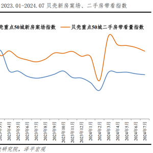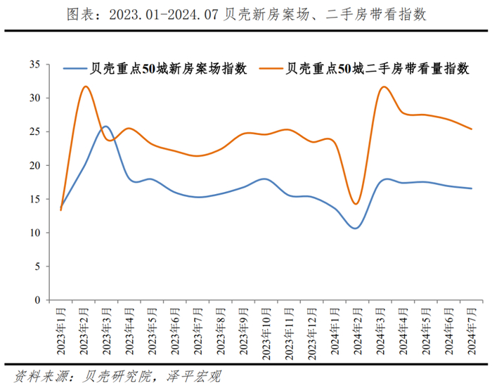 从前瞻性指标看,“517”政策组合拳仅带来了5月、6月指标的“脉冲性回升”。6月一线指标回暖的动能未能得到延续,7月前端房地产市场热度再度回落。具体来看,在“517”政策组合拳作用下,5月二手房带看指数环比小幅回落至27.5,但同比+20%,带看表现尚佳;5月新房案场指数回升至17.1,同比-3%,新房来访量低位修复;6月一线城市指标回暖,6月二手房带看指数环比-3%至26.8,但一线城市环比+2%至54.4;6月新房案场指数环比-3%至 16.6,但一线城市环比+14%至26.7;7月二手房带看指数环比-5%至25.4,新房案场指数环比-4%至15.9,7月前端房地产市场热度再度回落。