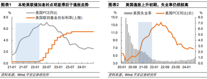 我们认为,虽然美联储在管理通胀预期方面起到一定作用,但也不宜高估这一作用。一方面,美联储在沃尔克和格林斯潘时代以来建立的信誉,加上鲍威尔领导的美联储最终敢于采取激进的紧缩行动,避免了长期通胀预期严重“脱锚”的风险。2022年以来,克利夫兰联储模型测算的十年通胀预期基本保持在1.8-2.4%区间,算是较好地稳定在2%目标附近,与1980年代4-6%的通胀预期形成鲜明对比。另一方面,通胀和通胀预期虽然互为因果,但前者对后者的影响同样不可忽视。通胀和通胀预期指标通常呈现很强的相关性。2021年3月至2022年3月,当PCE通胀率已经连续12个月高于2%后,克利夫兰的通胀预期指标在2022年4月升破2%。这表明,公众对于高通胀的保持观察一段时日后,才逐步调整对未来的通胀预期。所以后来通胀预期的回落,可能更多是通胀回落本身的作用,而非仅仅归功于美联储的政策引导。