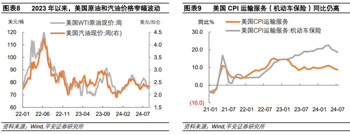 然而我们认为,美国通胀上行风险并不能完全排除。一方面,供给扰动是否还有逆转的空间,通胀因供给扰动的缓和能否继续回落,存在不确定性。从全球供应链压力指数、美国ISM制造业交付指数等指标来看,供应链压力似乎在2023年以来已经完全回归到2019年水平;以油价来看,2023年以来WTI油价和美国汽油价格基本保持窄幅波动。这意味着,供给扰动扭转贡献最大的时候可能已经基本结束。不过,一些指标显示,供给扰动仍在影响当前的通胀形势。截至2024年7月,美国CPI运输服务同比仍高达8.8%,其中“机动车保险”是主要的压力源,而这与疫情后美国汽车供应的短缺相关。