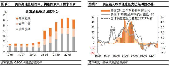 那么,未来美国通胀能够顺利回落到2%目标吗?鲍威尔没有详细展望未来的通胀前景。但是,其对通胀影响因素的分析,隐含了其对未来通胀继续回落的信心。鲍威尔对通胀分析的核心结论是,供给因素是影响通胀的最核心的原因。关于这一点,学界和业界基本也有共识。据OECD研究,在2022年二季度美国通胀最高的时候,“供给驱动”和“需求驱动”分别拉动标题通胀率3.4和2.0个百分点,意味着供给端对通胀的影响是需求端的1.75倍。目前,美国供给端的压力已经明显改善,并且保持相对稳定,以二手车价格为典型代表的“供给驱动型通胀”压力也明显缓和。如果未来不发生类似新冠疫情和俄乌冲突的供给冲击,且需求对通胀的影响没发生新的向上扰动,那么美国通胀前景将是乐观的。