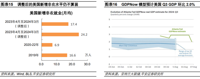 再往后看,美国经济衰退的证据尚不充分,不宜盲目押注“快降息”。就业方面,鲍威尔本次讲话指出,我们此前指出,基于统计学意义的“萨姆规则”,在当下有诸多局限性。正如鲍威尔本次讲话指出,目前失业率上升主要反映劳动力供给增加,但不是裁员人数增长所致。8月21日,非农就业人数基准被大幅下修,意味着在2023年4月至2024年3月,平均每月新增非农为17.35万人,而不是24.2万人。但是,这一水平仍不算弱,略高于2019年平均新增非农的16.6万人。增长方面,亚特兰大联储GDPNow模型显示,截至8月16日数据,预计美国三季度GDP环比折年增长2.0%。假设今年三、四季度GDP环比折年率分别为2%、1%,则2024年美国GDP年增长将高达2.6%。如果未来经济数据并不支持“硬着陆”,那么美联储大概率会控制降息节奏,保持对“双向风险”的关注。