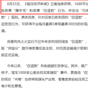 剑指羊毛党!1688宣布严厉打击恶意“仅退款”