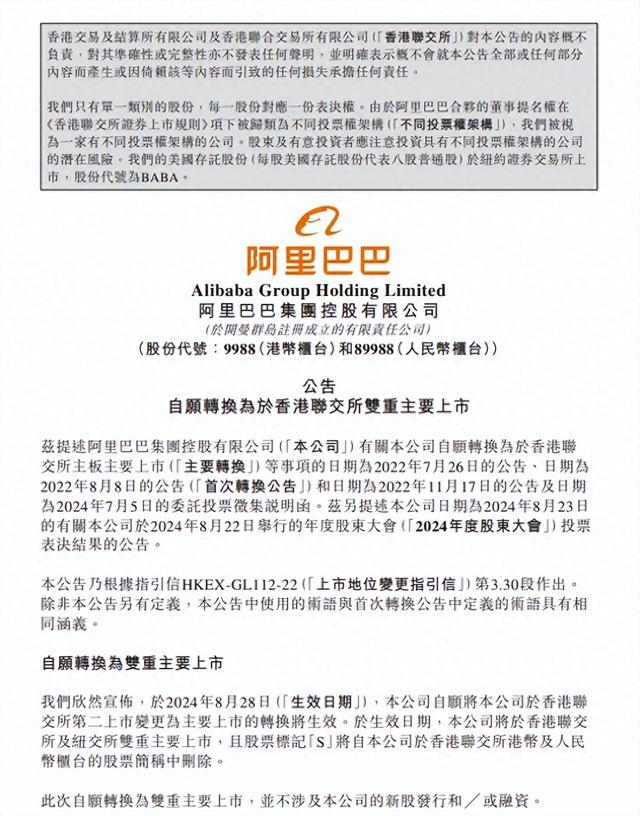直到2024年5月,时隔一年半后,阿里巴巴才在业绩报告中透露了新进展:“我们一直在为香港主要上市做准备,目前预计于2024年8月底完成转化。”