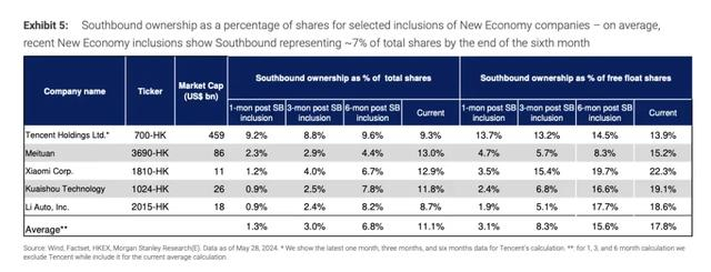 摩根士丹利根据美团、小米、理想汽车和小鹏汽车等公司的情况预测,在纳入港股通后,南向资金在前六个月内可能为阿里巴巴港股增加约120亿美元的增量流入。从长期来看,南向资金持股占比可能会稳定超过10%。