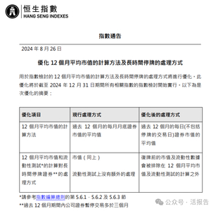 2024年8月26日,恒生指数公司发布公告,用于指数检讨的12个月平均市值的计算方法及长时间停牌的处理方式将进行优化。这一条“平平无奇”的公告,其中却隐含了恒指系列规则的重大调整。