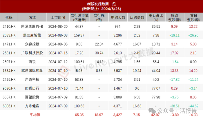 据LiveReport大数据,近10家上市新股平均发行市值为65.35亿,最大市值为黑芝麻智能,最小市值为瑞昌国际控股;平均发行PE为18.97倍,PE处于中上水平;平均申购人数为3,427人,平均认购倍数为7.15倍;平均基石占比为42.97%,基石平均比例跌下50%;