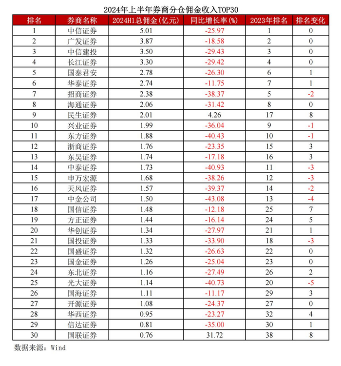 9月1日,2024年上半年各大券商分仓佣金收入榜单正式出炉。