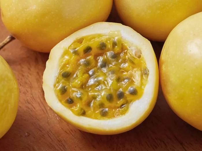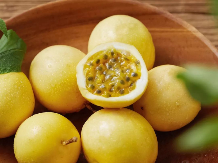 不同于普通的紫色百香果,这款百香果是台湾引进的品种——黄金百香果,是百香果中极特别的存在。