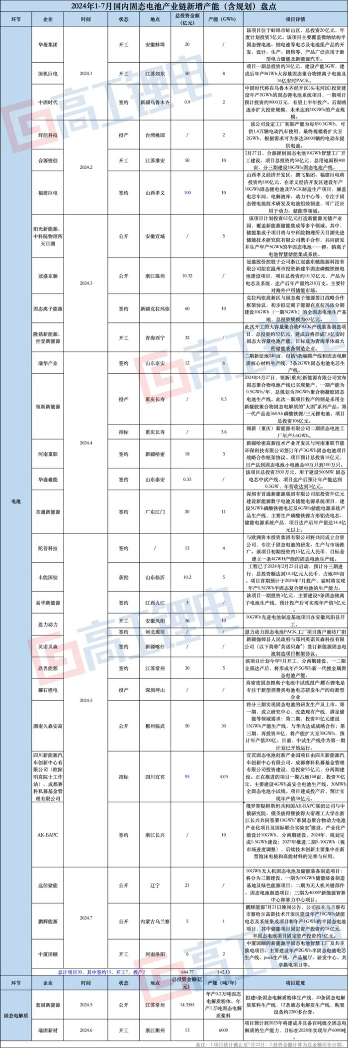 图说:2024年1-7月国内固态电池产业链新增产能(含规划)盘点