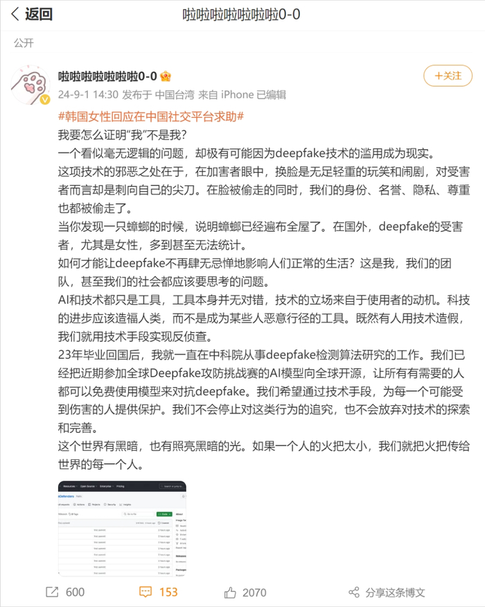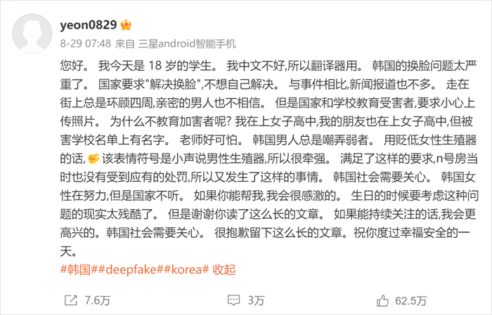 为了对抗,许多韩国女性在社交媒体上发帖,呼吁韩国和外界对Deepfake犯罪事件的关注。