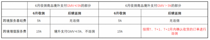 此外,正如何纺所关注的抽佣和返佣。“大服饰全球包邮计划”虽然设有高达20%的抽佣比例,但其中实际上包含了一项返佣政策。具体来说,若商家的月度境外订单支付GMV占比超过5%,那超过部分的跨境增值服务费(即15%)会先行收取,然后再予以返还。
