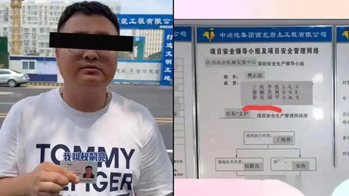 举报视频中曝光的项目信息栏图片显示,权某是山西农业机械发展中心项目安全生产领导小组的成员,担任现场技术负责。