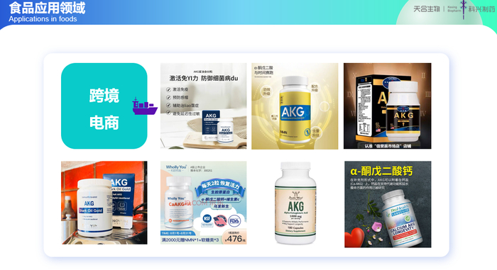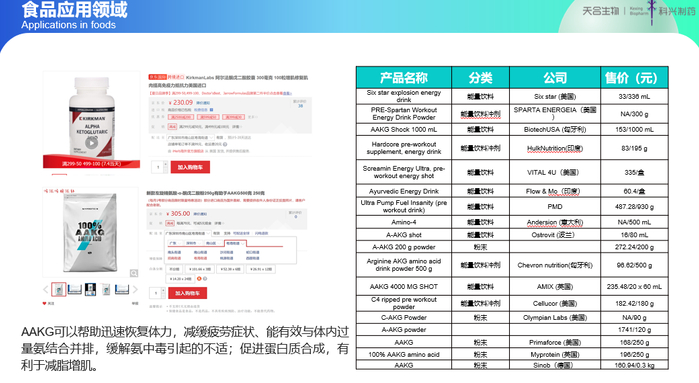 这是国外现有产品的一些例子。在国外,比较受欢迎的一个产品是AAKG,即精氨酸-α-酮戊二酸。这个产品的作用是在运动之后可以快速帮助恢复体力,缓解疲劳的症状,并且可以缓解氨中毒引起的不适。
