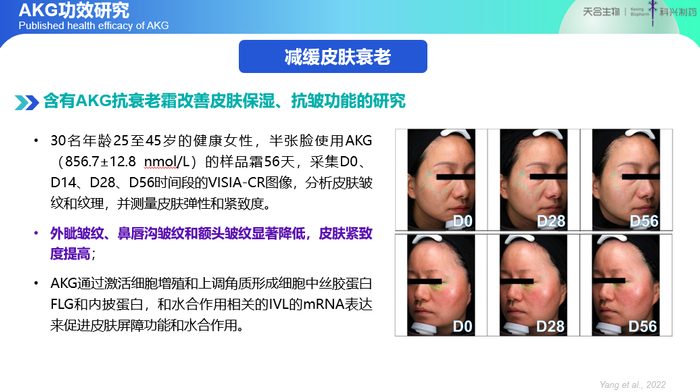 除了延长健康寿命之外,另外是在延缓皮肤衰老上的效用。30名中年健康女性每天使用含有AKG的面霜,56天之后可以看到她的眼尾纹、法令纹、额头纹等都有了改善,并且皮肤的紧致度有所提升。这个的机理是通过促进皮肤的屏障作用和水合作用来达到的。