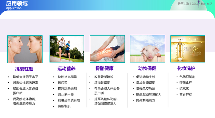 一个产品的应用主要有两方面的限制:法律法规和功效。根据之前的功效总结,无论是抗衰驻颜领域、运动营养领域还是骨骼健康领域,它都可以发挥作用。在动物保健领域,目前天合正在开展实验,拓展其在宠物保健以及饲料方向的应用。它在面霜中也能起到良好的抗衰效果。