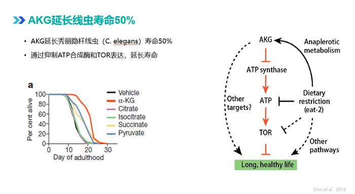 从已经公开发表的文章来看,AKG在延长寿命和健康寿命方面的研究是非常丰富的。我这里优选了三篇有代表性的文章与大家分享。特别是2014年发表在《Nature》上的文章,2020年发表在《Cell》子刊上的文章,以及2021年发表在《Aging》上的人体临床文章。在线虫的研究中,研究者发现AKG可以抑制APT合成酶和TOR的表达,最终实现延长线虫50%寿命的效果。
