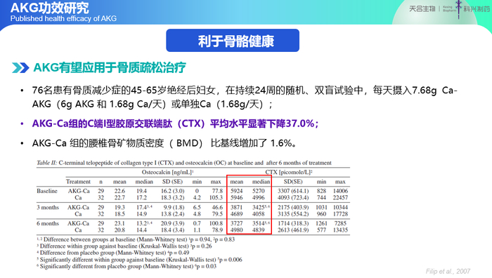 这是一篇针对绝经后妇女的研究。在研究中,76名患有骨质减少症的绝经后妇女每天补充一定量的AKG钙或单独使用AKG,持续24周,发现C端I型胶原交联端肽(CTX)的平均水平显著下降。CTX是1型骨胶原蛋白分解后的产物,CTX的下降表明1型骨胶原的分解减少,代表骨质流失减少。其次,观察到受试者腰椎骨矿物密度比基线有所增加。